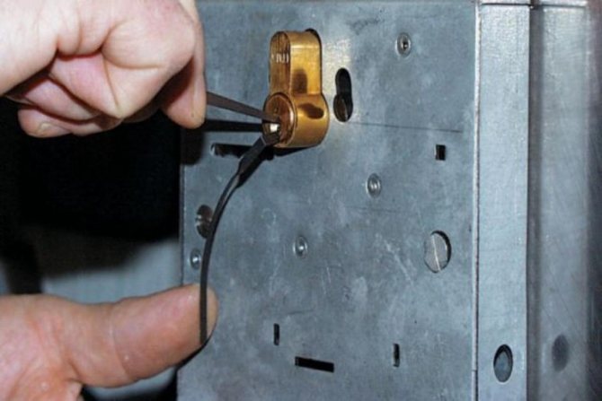 - Utilisation d'un crochet de verrouillage. Étant donné que la serrure fonctionne au moyen de goupilles, à action mécanique, vous pouvez les déplacer dans la position souhaitée, l'appareil s'ouvrira.