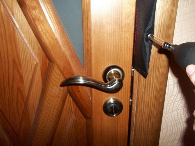 Si la serrure a une languette, vous avez besoin d'une plaque métallique ou d'un tournevis fin. Il est inséré dans l'espace entre le cadre de la porte et le châssis. En appuyant sur l'outil, vous devez repousser la languette, puis la porte peut être poussée et ouverte.