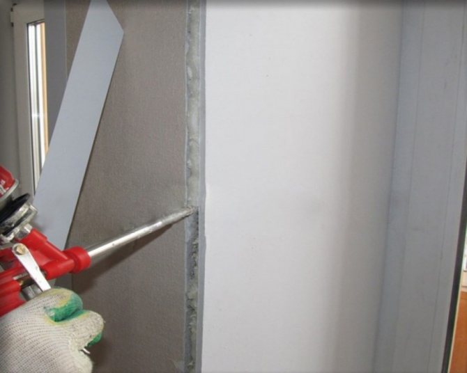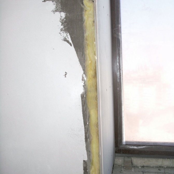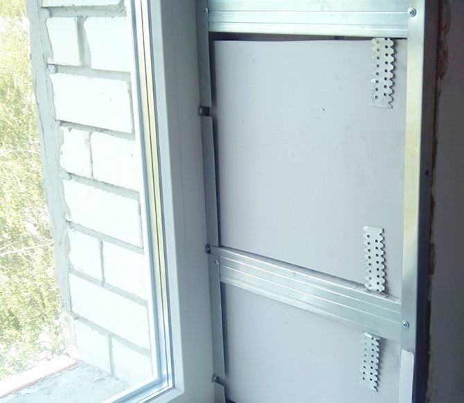 En outre, les cloisons sèches peuvent être plantées sur une surface préparée à l'aide de mousse ou de colle. Le profilé en "L" métallique est fixé le long du périmètre du cadre de la fenêtre. Des feuilles de cloison sèche y sont attachées. Cette méthode est utilisée lorsque les installateurs ont fait de gros efforts et que l'ouverture de la fenêtre a été gravement endommagée.