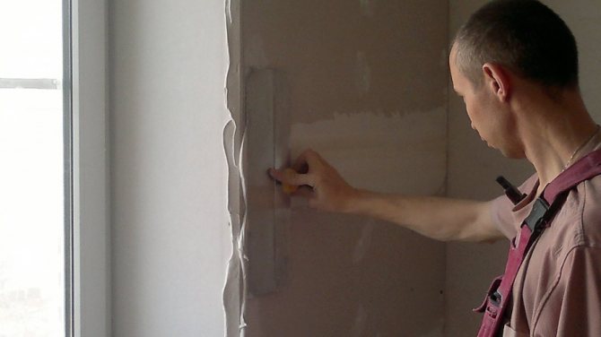 Nous préparons, nivelons la surface. Nous enlevons l'excès de plâtre, la peinture, toute la saleté. Nous traitons avec un apprêt. Et aussi le côté jointif de la cloison sèche (le côté qui sera adjacent au mur). Nous attendons le séchage.