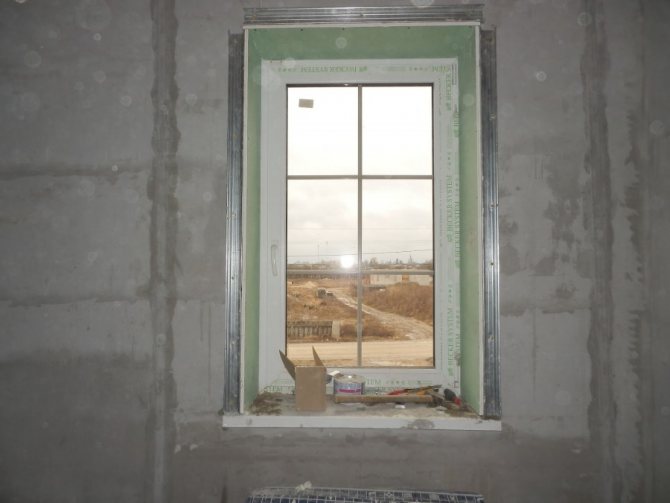 Retirez le film protecteur du profilé installé. Ou nous le coupons le long du contour jusqu'à 20 mm à la jonction supposée de la fenêtre avec une feuille de cloison sèche. Nous marquons les limites de la structure pour le placement correct des éléments verticalement et horizontalement.