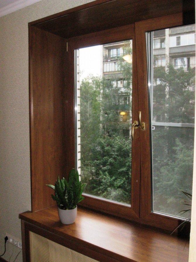 Ce type de pente est réalisé après l'installation de fenêtres classiques en bois. Pour mettre en valeur le design intérieur. De cette façon, vous pouvez disposer une fenêtre en métal-plastique stratifiée sous un arbre.