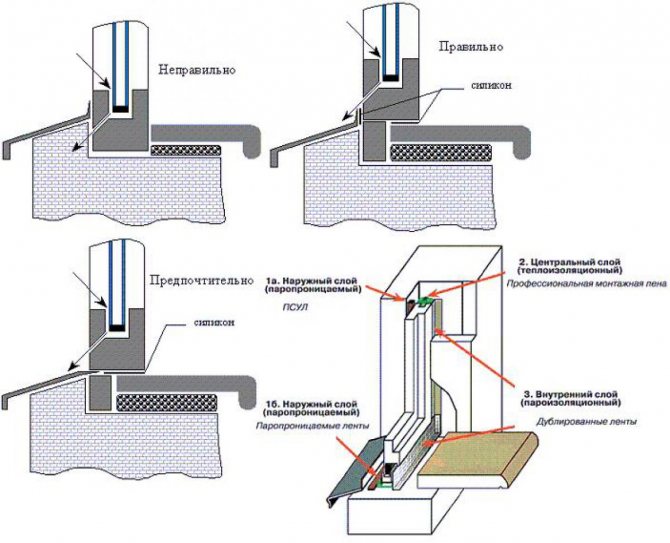 Si un système de chauffage et de ventilation est correctement mis en œuvre dans une pièce vitrée de cette manière, une telle approche peut ne pas causer de plaintes pendant assez longtemps. Cependant, le plus souvent, les espaces de montage nécessitent une meilleure finition, ce qui empêchera la pénétration d'humidité de l'extérieur et, si elle apparaît à l'intérieur du joint, facilitera le drainage vers l'extérieur.