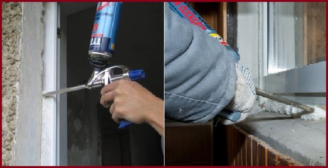 Si votre échantillon particulier est protégé du fond avec un film, retirez-le, sinon tout peut arriver. Nous commençons l'installation directement à partir de la rainure dans le bloc de fenêtre. Moussant sa tablette inférieure, en appuyant à peine sur la détente du pistolet: