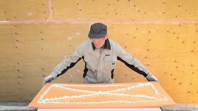 Le mélange de colle est réparti uniformément sur la feuille de mousse, en bandes, en s'éloignant des bords. Ensuite, des rayures sont dessinées le long des diagonales. Vous pouvez utiliser n'importe quelle colle adaptée à la mousse de polystyrène et avec des additifs contre les champignons et les moisissures.