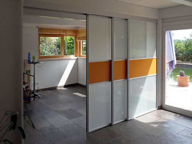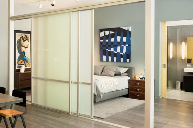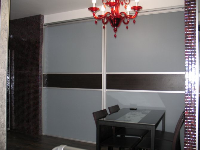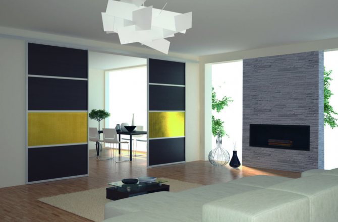 - Dans les quartiers d'habitation, des cloisons mobiles sont utilisées, elles sont utilisées, si nécessaire, pour prévoir la possibilité de transformer les volumes de l'habitation avec un changement de leur fonctionnalité. Dans un studio, une telle cloison peut être utilisée pour séparer l'espace cuisine.