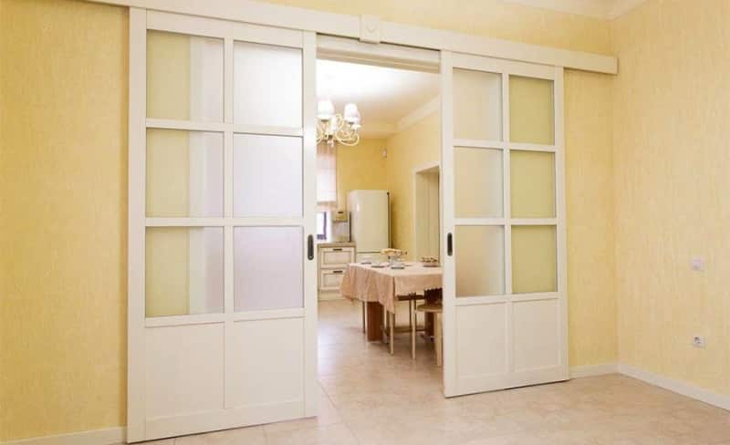- Avec guides au sol et en haut de la cloison. Ici, la charge est uniformément répartie entre les rouleaux supérieurs et inférieurs, ce qui facilite leurs conditions de travail et prolonge leur durée de vie. Dans le même temps, la présence d'un seuil en forme de guide inférieur crée certains inconvénients en fonctionnement.