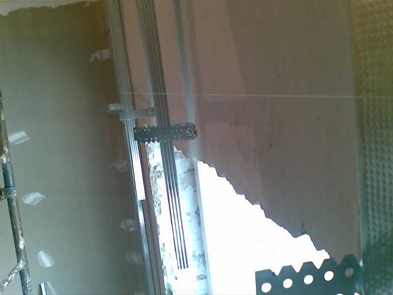 - Installation de balises entre les règles et la fenêtre pour déterminer l'épaisseur du plâtrage à différents endroits;