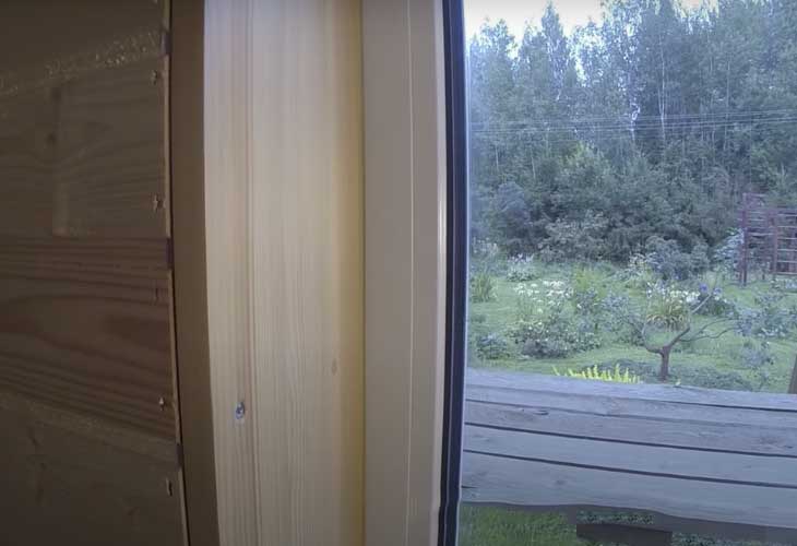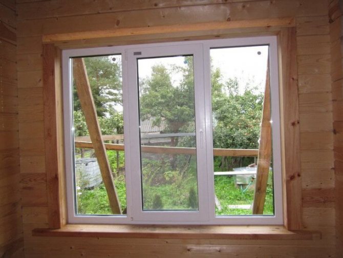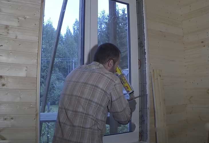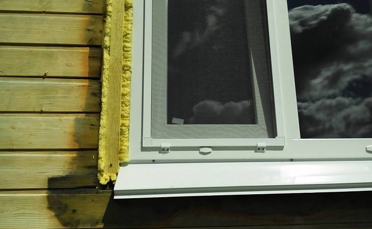 La boîte est placée de manière à ce qu'il y ait une distance entre le boîtier et le cadre, ce qui égalise l'inclinaison du cadre lorsque la maison en bois rétrécit. L'espace après la fixation de la fenêtre est scellé avec de la mousse et après durcissement, les parties saillantes sont coupées avec un couteau de construction. La finition externe et interne des pentes protège la mousse de la destruction sous l'influence des facteurs atmosphériques.