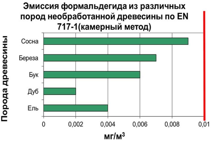 Pour être honnête, il convient de noter que la source de formaldéhyde peut être non seulement la résine synthétique, mais également le bois lui-même, qui est traditionnellement considéré comme la norme de respect de l'environnement. Les émissions de formaldéhyde du bois fraîchement récolté peuvent atteindre 0,2 mg / m 3. Avec un séchage approprié du bois scié, cet indicateur diminue et devient nettement inférieur au fond créé par une colle synthétique de mauvaise qualité.