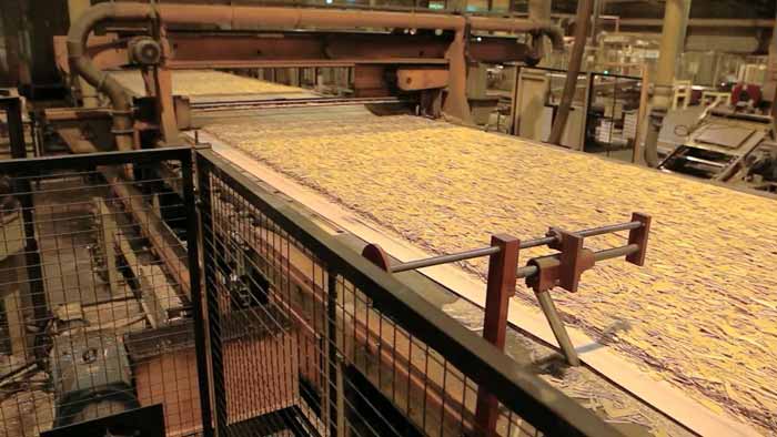 - Les couches de dalle sont divisées en externe et interne. Pour la couche externe, de la résine naturelle est ajoutée aux copeaux et pour la couche interne, des produits chimiques avec des composants supplémentaires sont ajoutés.