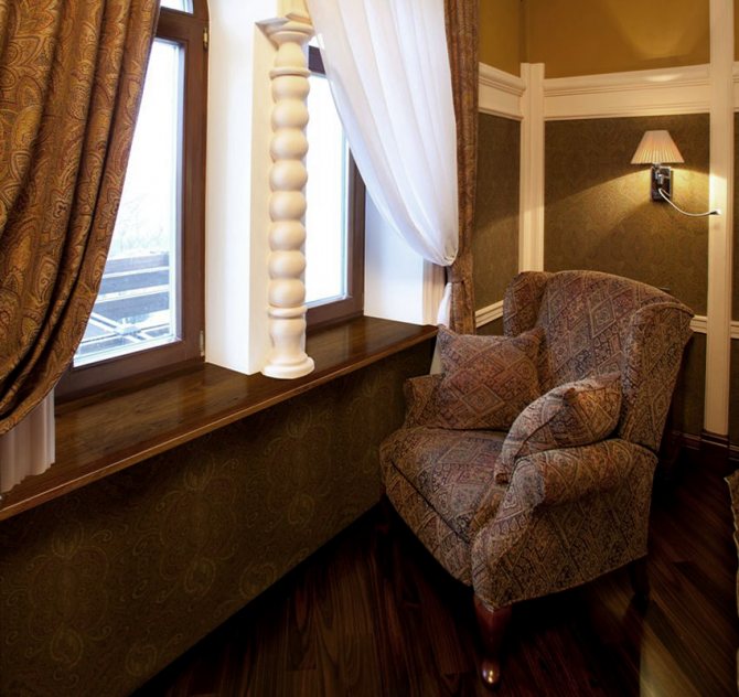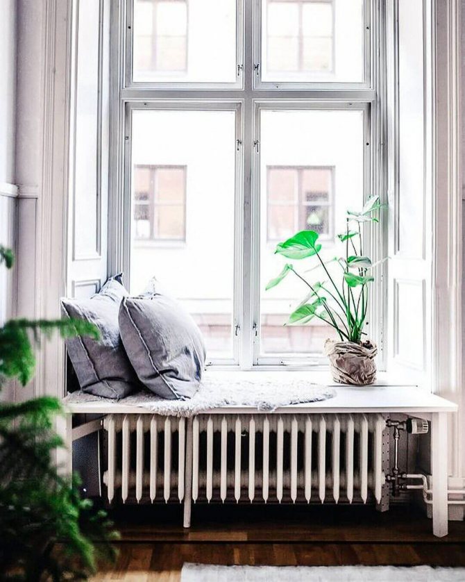 Un rebord de fenêtre en tant que coin salon diffère d'un rebord de table ou d'un plateau de table principalement en hauteur. Il n'est pas très pratique de monter sur l'élément structurel habituel de la fenêtre, qui est traditionnellement situé à une hauteur d'environ 90 centimètres du sol. Et la largeur habituelle du rebord de la fenêtre - 35 à 40 centimètres - ne vous permettra pas de rester confortablement.