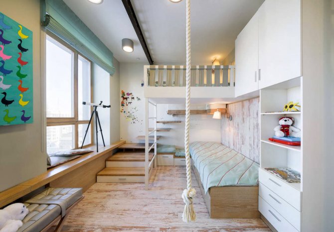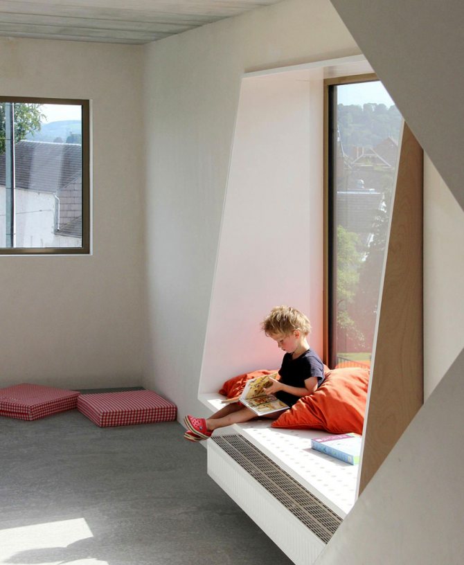 - Lieu de couchage sous la fenêtre. C'est le rebord de fenêtre qui est considéré comme la solution la plus fonctionnelle et la plus pratique. Il est particulièrement important d'organiser cette option dans le cas où il y a des fenêtres hautes et volumineuses dans le boîtier.