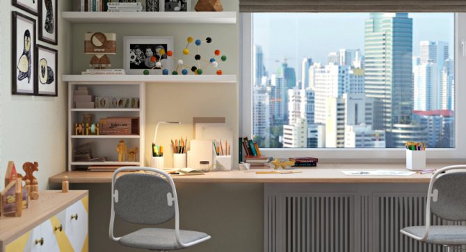 - Dans le bureau ou les chambres d'enfants, le rebord de la fenêtre servira de bureau sur lequel vous pourrez placer des ordinateurs ou organiser un espace scolaire pour faire des cours. De plus, une table dans un tel endroit est un arrangement très rationnel. C'est donc à cet endroit qu'il y aura une abondance de lumière naturelle.