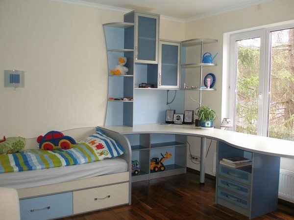 Une solution tout aussi fonctionnelle est un rebord de fenêtre de comptoir dans la pièce. Ce modèle est une continuation de la fenêtre et peut être utilisé comme lieu d'étude pour un enfant. La poursuite du rebord de la fenêtre dans la crèche vous permet d'utiliser la surface à des fins différentes, par exemple pour ranger des jouets, et les écoliers peuvent placer des fournitures éducatives, des livres, des disques.