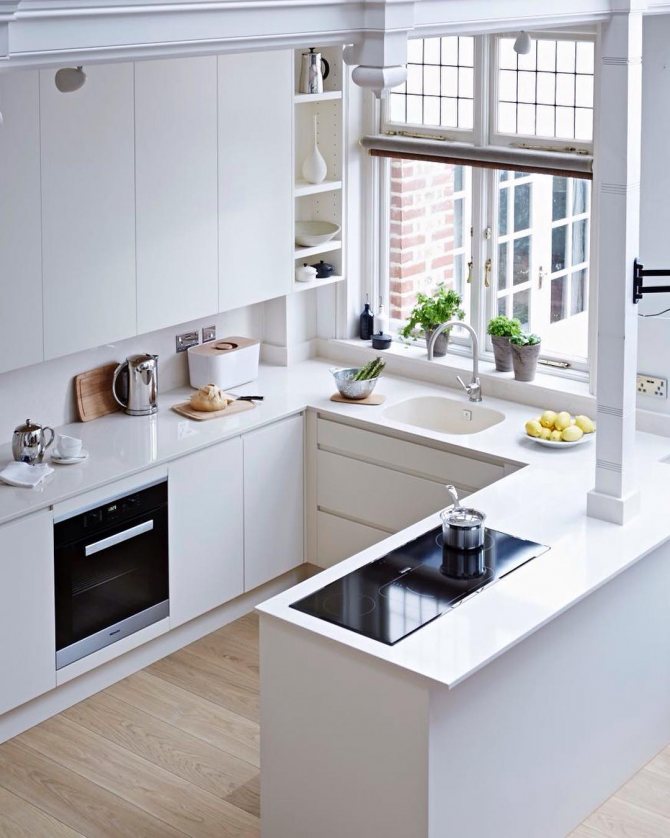 Donc, nous avons déjà parlé de la surface de travail dans la cuisine, mais vous pouvez aller plus loin, par exemple, encastrer un évier juste devant la fenêtre, ce qui libérera un peu plus de place. Dans une salle à manger spacieuse, en utilisant le rebord de la fenêtre, vous pouvez créer une zone de cuisson circulaire sur tout le périmètre de la pièce, ce qui est très pratique dans une grande famille, où au moins deux femmes au foyer effectuent les sacrements dans la cuisine.