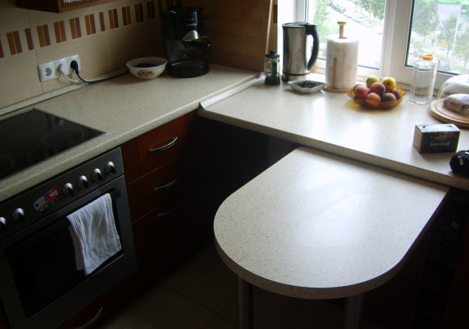 Un rebord de comptoir est installé dans la cuisine après le démontage de l'ancien panneau. C'est l'une des meilleures solutions dans une petite cuisine, puisque l'élément ne prend pas d'espace libre, vous pouvez construire une structure transformable lorsque le dessus de la table se plie et se plie lorsqu'il n'est pas nécessaire.