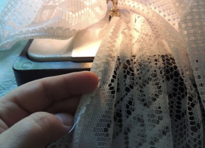 - Avant d'ourler le tulle sur les côtés, vous devez le couper et le repasser uniformément. Si la toile est en coton, nous utilisons la méthode du "fil de traction". Si le synthétique devra bricoler plus longtemps. Mesurez bien la longueur, tracez une ligne le long de la règle et coupez droit. Nous posons le rideau sur une surface plane à l'envers, le replions sur 1 à 2 cm et le repassons avec un fer à repasser.