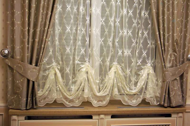 Cette méthode convient aux rideaux composés de deux feuilles. Nous tirons chacun d'eux avec un cordon décoratif à une distance égale à la hauteur de la toile du bas au rebord de la fenêtre. Au niveau du rebord de la fenêtre, nous fixons les supports par les côtés et y accrochons les extrémités du cordon. Vous obtiendrez des "lampes de poche" volumétriques.