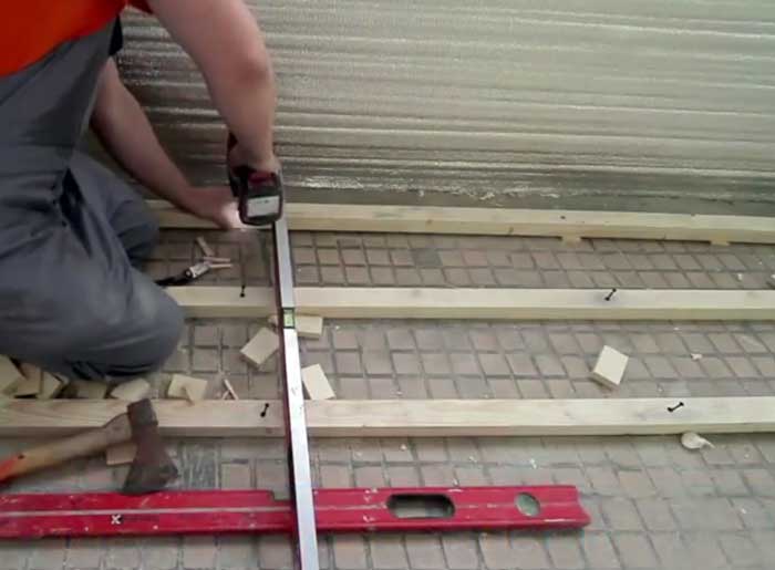 - Le pas du décalage ne doit pas dépasser 50 cm et il est recommandé de laisser la distance entre eux et les murs du balcon de 0,5 à 1 cm, ce qui garantira un mouvement confortable du sol en cas de séchage ou de gonflement du décalage;