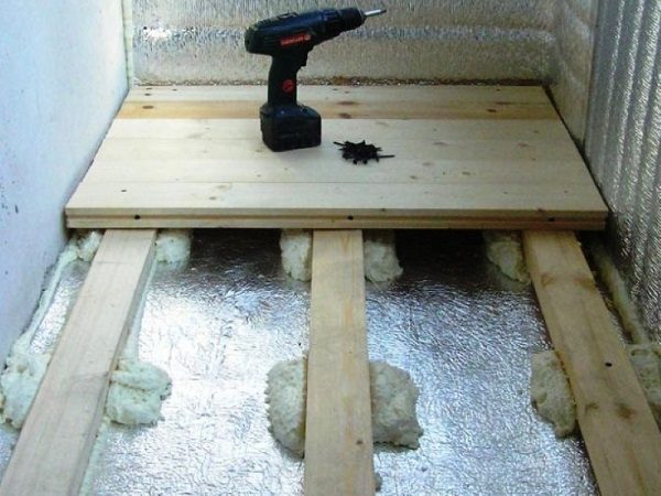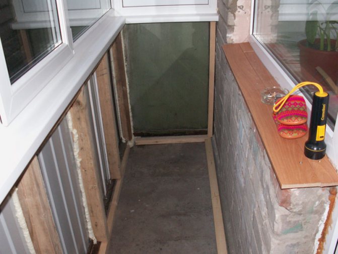Si le sol du balcon est encore solide et ne nécessite pas de réparations majeures, il est simplement nettoyé, les fissures sont scellées avec du mortier, les autres défauts sont corrigés et procèdent immédiatement à la construction du plancher en planches.