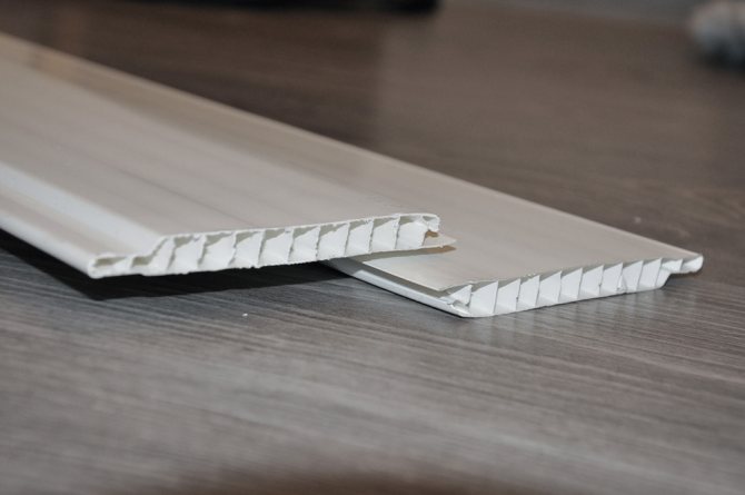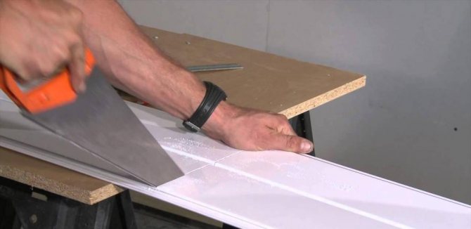 Lorsque la bande de départ est renforcée sur tout le périmètre, mesurez la distance entre le cadre avant et la paroi arrière. Coupez les bandes de 1 cm plus courtes des panneaux pour laisser de petits espaces. Ils sont nécessaires car à mesure que la température augmente, les panneaux en PVC deviennent légèrement plus longs.