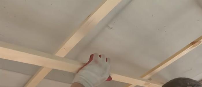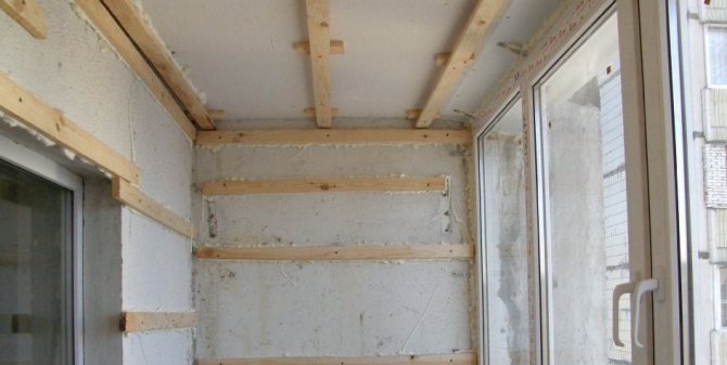 Il est préférable d'assembler le cadre à partir de blocs de bois et non de profilés métalliques. Le métal rouille avec le temps et des taches apparaissent sur les panneaux. La taille appropriée du bois est de 20x45 mm. Les lattes sont renforcées le long du balcon: l'une est montée près du mur, la seconde - au centre du plafond.