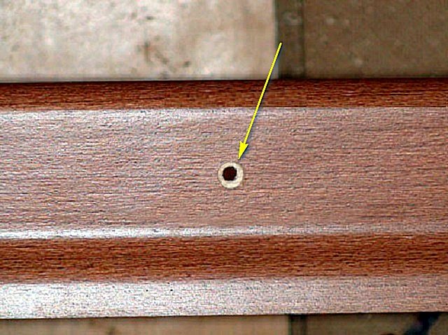 | Ensuite, à l'aide d'un poinçon, des trous sont faits pour les chevilles. Pour rendre la pièce moins poussiéreuse, il est recommandé de poser le tuyau de l'aspirateur en marche à côté du trou percé, ce qui attirera immédiatement la poussière de bâtiment générée. Dans le même temps, le canal du goujon lui-même sera nettoyé. | |