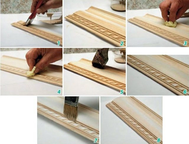 Ensuite, le mastic est appliqué en couche mince sur toute la surface de la plinthe, séché et également poncé.