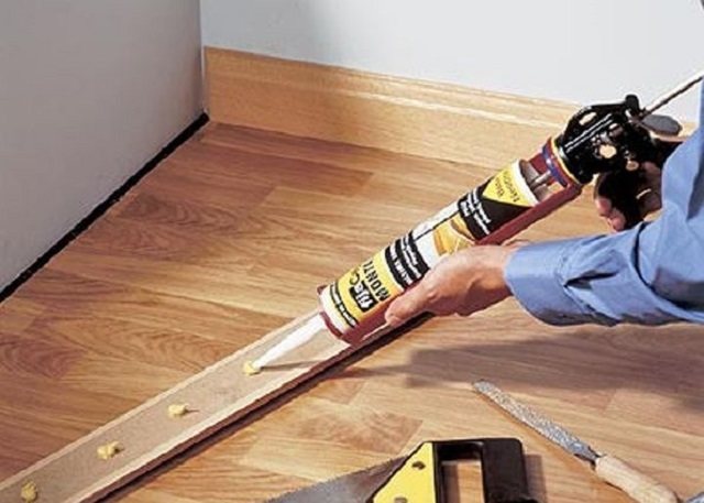 La fixation d'un socle en bois au mur à l'aide de vis autotaraudeuses est un processus assez compliqué, mais également fiable. Il est plus facile de fixer l'encadrement du revêtement de sol avec de la colle, et le plus souvent des "clous liquides" sont utilisés à cette fin.