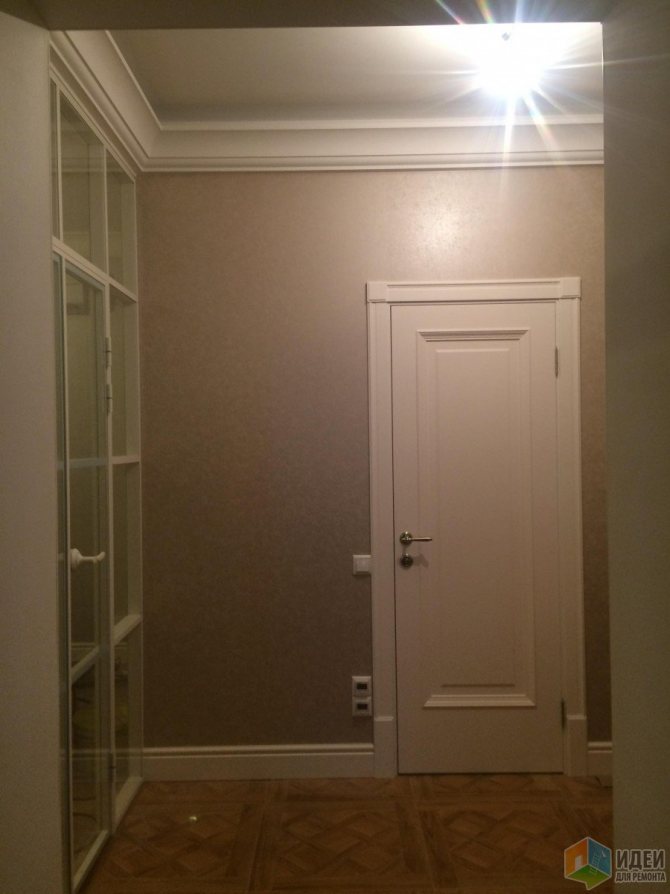 D'autre part, la porte du compartiment jouxte la bordure de deux revêtements différents - papier peint blanc et vinyle quartz foncé :