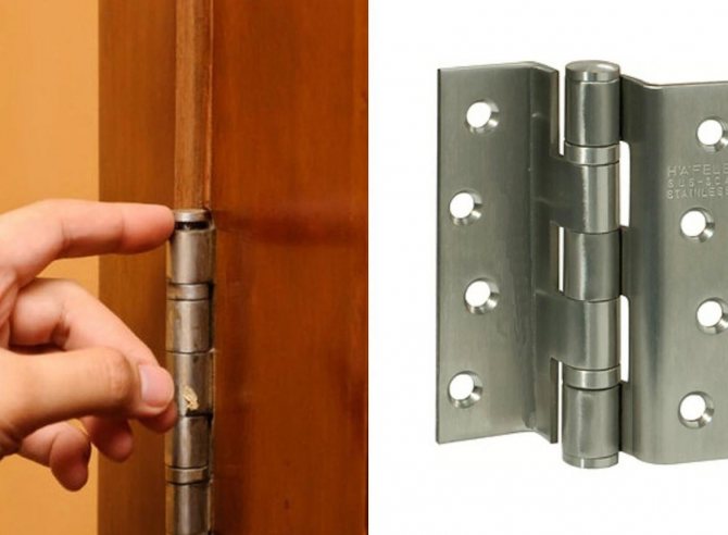 En raison des caractéristiques de conception de ces portes, il est nécessaire de sélectionner des ferrures spéciales. Tout d'abord, nous parlons de charnières. Comme leur axe est légèrement décalé à l'extérieur du porche, les modèles suivants conviendront ici: