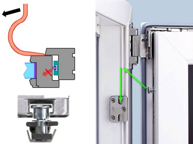2. Gâche anti-effraction. La gâche anti-effraction diffère de la conception plus robuste habituelle et d'un grand nombre de points de fixation - 3 contre 1 pour un conventionnel. La forme de la barre anti-effraction est telle que la goupille anti-effraction qu'elle contient ne peut pas être désengagée avec elle en poussant le vantail hors du cadre. Avec un tel mouvement, la partie "champignon" en saillie (comme un chapeau de champignon) de la goupille repose contre les saillies de la gâche anti-effraction. Les conceptions des gâches conventionnelles et anti-effraction, ainsi que la direction du mouvement du tourillon lorsque le châssis est pressé, sont illustrées dans la figure ci-dessous en utilisant l'exemple des ferrures Roto.
