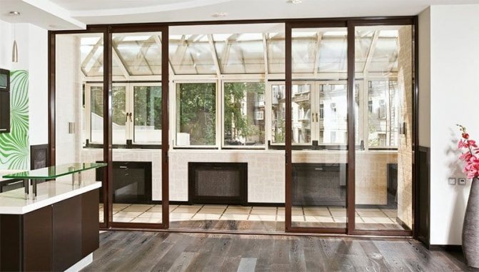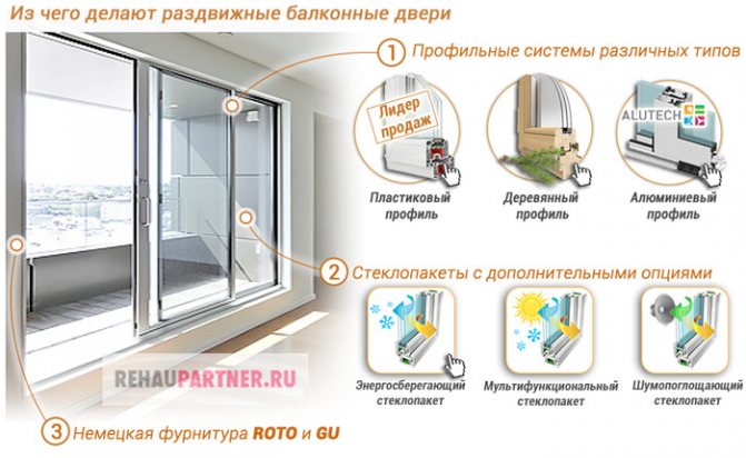 Pour la production de portes coulissantes vers le balcon, il est nécessaire d'utiliser un profilé fiable conçu pour de lourdes charges. Les profils allemands Rehau et KBE ont fait leurs preuves. En outre, pour la fabrication de cadres et de châssis, des matériaux naturels à base de pin, de mélèze et de chêne sont largement utilisés. Parce que la zone principale de la structure de la porte coulissante est occupée par la partie transmettant la lumière, puis pour une meilleure économie de chaleur, une attention particulière doit être accordée à la fenêtre à double vitrage.