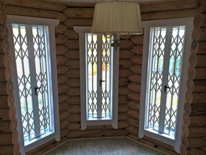 Si vous devez installer une grille sur les fenêtres d'une maison de campagne, il est peu probable que des éléments de soudage et de forgeage soient nécessaires. Surtout si la maison est simple, en bois. Dans ce cas, les détails verticaux sont situés à une distance importante les uns des autres, de sorte que la lumière naturelle ne sera pas ombragée.