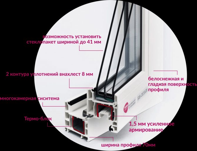 - Conception SIB: système à 3 chambres avec chambres thermobloc (5), profondeur 70 mm. Grâce à la chambre isolante «thermobloc», les fenêtres sont souvent installées dans des régions avec une différence de température de plus de 60 C.