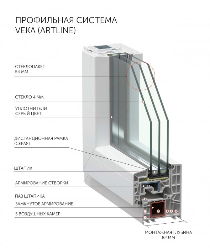 - Artline: système à 6 chambres de 82 mm de large. Convient pour la fabrication de fenêtres et de portes de balcon. Trois circuits d'étanchéité. Le châssis de la fenêtre est caché derrière le cadre.