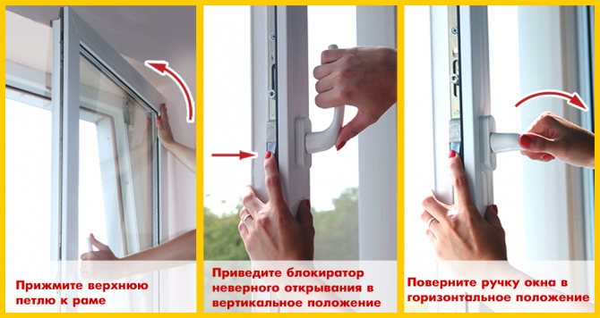 - L'utilisation de la force brute lors de l'ouverture d'une fenêtre peut également provoquer l'ouverture du châssis deux fois. Le mécanisme est le plus vulnérable juste lorsque la poignée est dans des positions intermédiaires entre les modes principaux, de sorte que l'utilisation d'une force excessive peut provoquer une position où l'ouvrant est suspendu à une charnière. Si la fenêtre ne cède pas sans recourir à la force, c'est aussi une raison d'appeler le maître, peut-être que le mécanisme de verrouillage doit être lubrifié et ajusté.