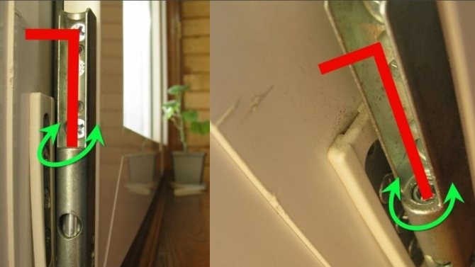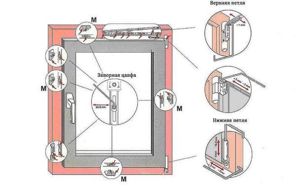Lorsque la poignée est complètement fermée, la force de serrage doit être légèrement réduite. Pour cela, il existe des excentriques spéciaux du côté de la poignée à l'extrémité du châssis de la fenêtre, ainsi que des boulons de réglage sur les charnières de l'autre côté. Plus de détails à ce sujet seront écrits ci-dessous dans le réglage du mécanisme de serrage.