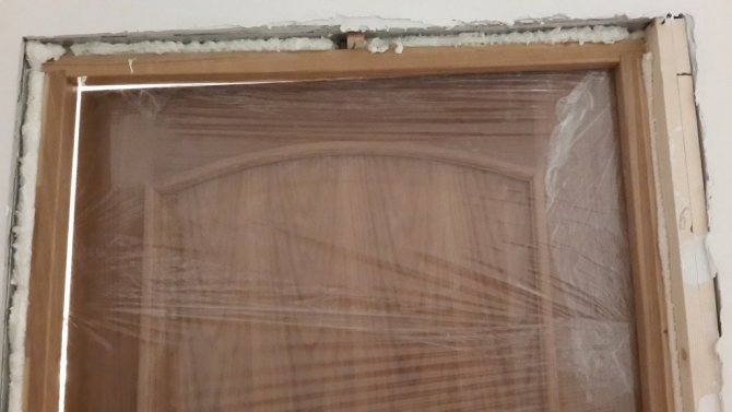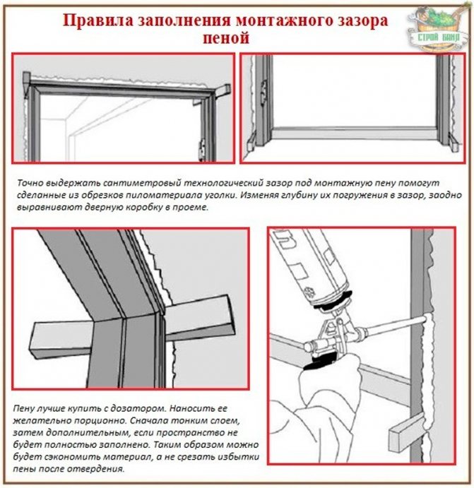 - Une fois la position fixée, vous pouvez mousser les espaces entre le mur et les planches. Dans ce cas, il est nécessaire de sécuriser la structure avec des entretoises, car les éléments peuvent être déplacés. La technologie ne permet pas simplement de faire mousser un cadre de porte.