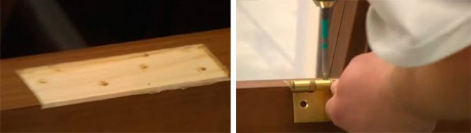 Après avoir retiré la porte de la structure assemblée, à l'aide des outils disponibles, il est nécessaire de découper des évidements dans le coffre et l'extrémité de la porte, correspondant à l'épaisseur et au contour des plaques de charnière. Ensuite, les charnières sont installées dans les «nids» préparés à l'aide de vis autotaraudeuses (généralement, elles sont incluses avec les charnières).