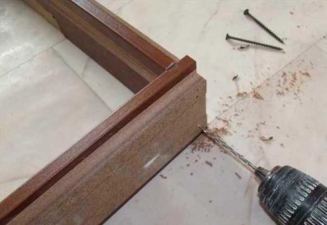 - Les côtés sciés à 45 degrés doivent être rapprochés. Pour l'assemblage, vous aurez besoin de vis autotaraudeuses pour le bois d'une longueur d'au moins 55 mm et d'une perceuse avec perceuse. Pour éviter que le MDF ne se fissure, vous devez d'abord percer des trous d'un diamètre légèrement plus petit que la vis autotaraudeuse vissée, d'environ 2-3 mm. Les vis autotaraudeuses sont vissées de deux côtés extérieurs de chaque coin - du haut 2 et du côté au centre 1.