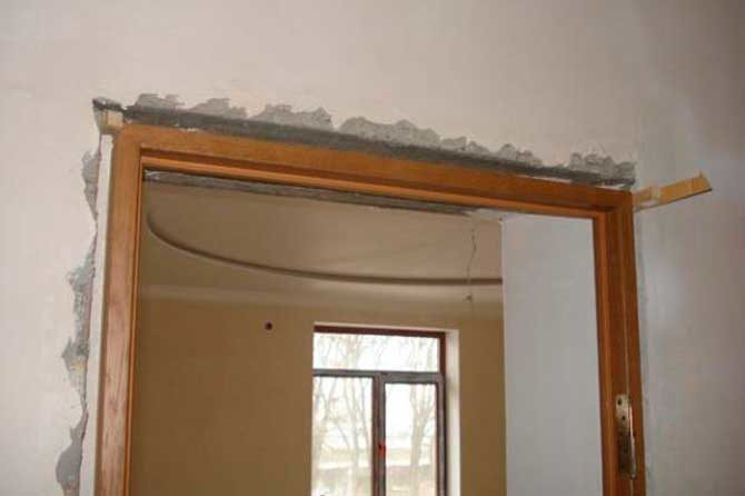 - Si, en essayant les pièces vissées, la hauteur de l'ouverture ne vous permet pas de placer la structure avec précision, vous pouvez le faire - abattez le plâtre du haut de l'ouverture et sciez la poutre située au milieu du ouverture.