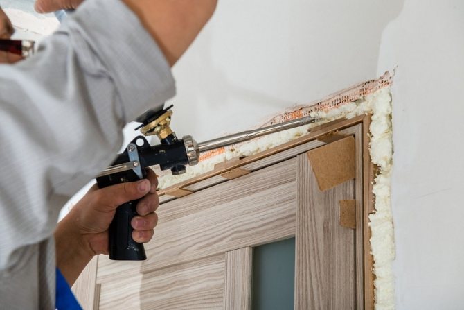 Dans l'espace entre la porte et le cadre sur tout le périmètre de la structure, il est nécessaire d'insérer des entretoises (par exemple, des bandes de carton d'épaisseur appropriée (≈ 3 mm). La procédure suivante consiste à remplir l'espace restant entre la porte et le cadre avec de la mousse.