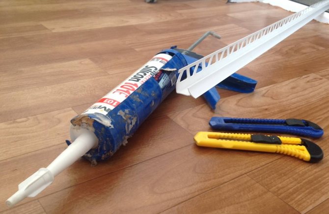 Appuyez ensuite sur le levier du pistolet à cartouche pour relâcher la pression, l'acrylique a cessé de sortir du cylindre. La ligne acrylique doit avoir un diamètre de 4 à 6 millimètres. Remplissez immédiatement les pauses, les lacunes de la ligne acrylique. Ensuite, nous courons le long du coin avec notre doigt, enlevant l'excès d'acrylique, laissant une couche de un à deux millimètres.