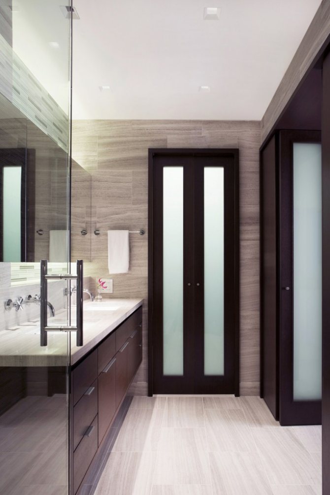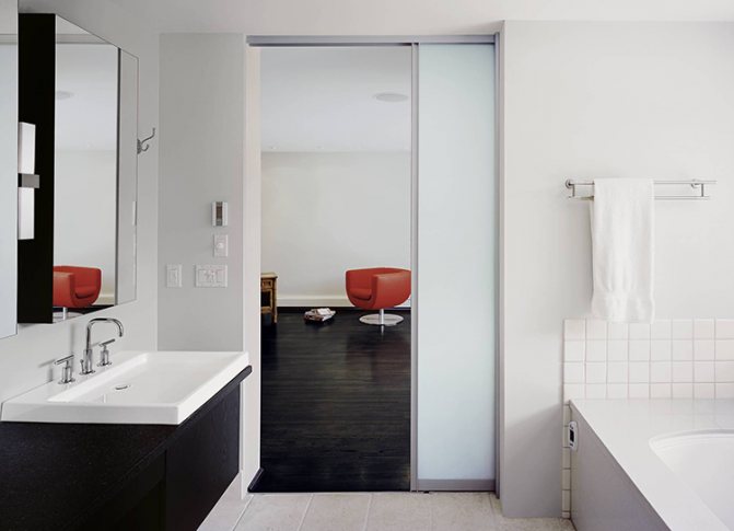 Les portes de la salle de bain, des toilettes, des dimensions, qui ne diffèrent pratiquement pas, doivent être sélectionnées correctement. En règle générale, pour l'harmonie, une structure du même métrage est installée dans les toilettes et dans la salle de bain.