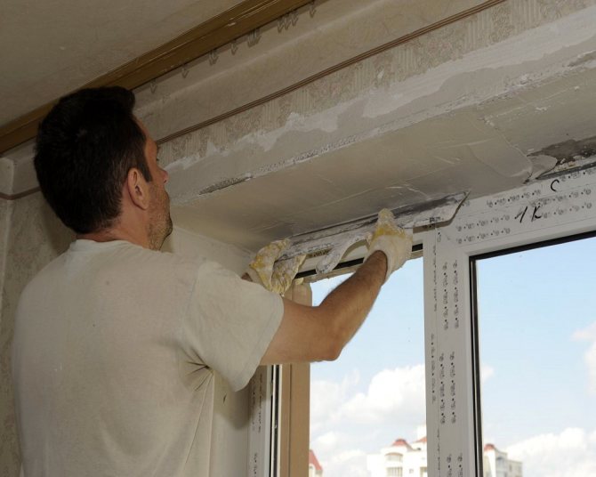 Le premier est une couche de mastic de départ. A ce stade, les gros défauts de surface sont neutralisés. En règle générale, la solution de départ est très abrasive. Le matériau doit être appliqué en deux couches: le long des pentes et de la fenêtre aux coins. Après avoir terminé le revêtement initial, vous devez attendre qu'il durcisse complètement (au moins un jour). La deuxième couche est réalisée avec des mouvements à travers la première. Cela aidera à obtenir une surface plane sur les pentes. Parfois, si la surface ne présente pas d'irrégularités significatives et que le plâtre a été appliqué avec une haute qualité, l'application du mastic de départ peut être négligée.