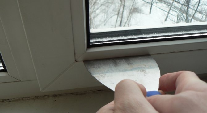 - Le dernier cordon de vitrage supérieur, si vous en faites un, par sécurité, nous faisons simplement levier, mais ne l'éteignez pas. Si vous avez une fenêtre aveugle, nous tenons des joints plats en plastique supplémentaires, qui se trouvent autour du périmètre de la vitre.