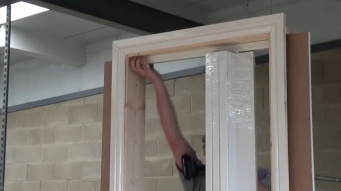 Le nouveau cadre de porte est assemblé à partir des accessoires achetés. Vous pouvez les acheter dans les magasins officiels du fabricant qui fabrique des tissus et des accessoires. Dans le coin supérieur, la traverse supérieure est fixée avec des vis autotaraudeuses. La boîte assemblée est insérée dans l'ouverture. Les compléments sont fixés avec des ancres. Une boîte en forme de lettre "P" est installée dans l'ouverture, fixée avec des boulons d'ancrage et de la mousse. Lorsque vous travaillez, il vaut la peine d'utiliser un niveau pour éviter les distorsions de la boîte. Après séchage complet de la mousse, passez à l'étape suivante du travail.