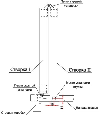 Schéma de montage d'un vantail de porte à deux vantaux.
